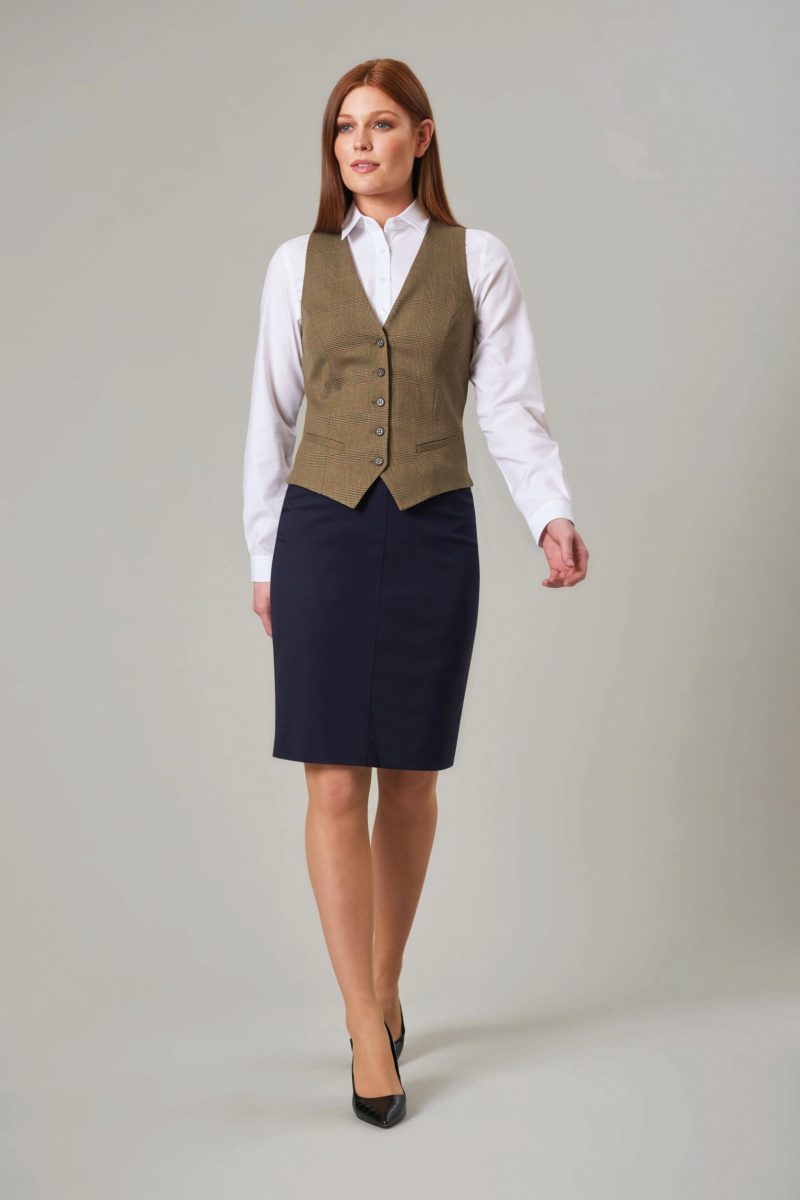 54% polyester / 44% laine / 2% Lycra® avec finition anti-taches Nanotech. Jupe avec fente centrale arrière et doublure extensible (longueur 56cm). Tissu performant : test pilling 4/5 et test de Martindale : 60,000 frottements sans casses. Lavable en machine à 40° ou nettoyage à sec.